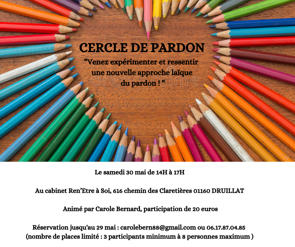 Un Cercle de Pardon vous donne l’occasion de faire œuvre de pardon vis-à-vis des autres et de vous-même, y compris par rapport à des personnes non présentes, sans avoir à évoquer devant autrui vos problématiques ou blessures personnelles.